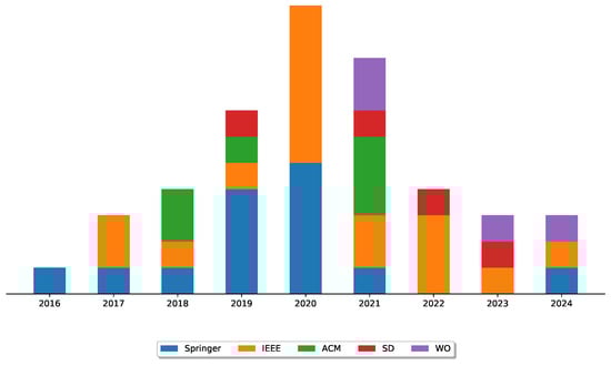 The search process was carried out in August 2024, resulting in the identification of 45 unique papers that were published from 2016 onwards. The formulated query was employed across the chosen libraries, and Table 5 illustrates the count of papers retrieved from each of these libraries.