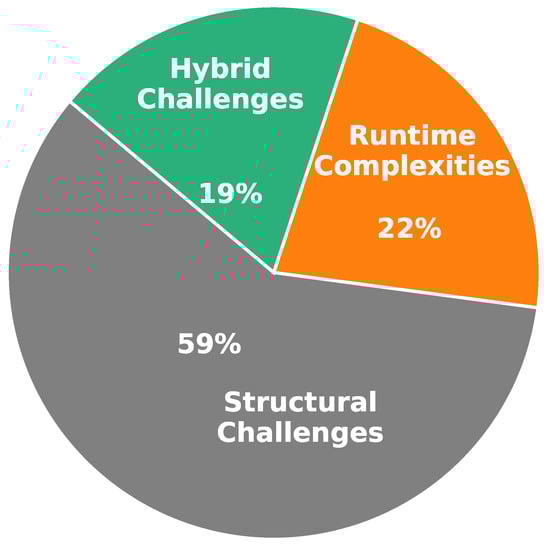 Microservice identification, as a pivotal phase in migrating from monolithic to microservice architectures, brings unique challenges that threaten the quality, scalability, and maintainability of the resulting system. These challenges may stem from structural issues within the monolith, runtime complexities, or the inherent trade-offs in service design. To achieve effective decomposition, all challenges, regardless of their origin, need to be identified and addressed. In this study, we explored the focus of existing research with respect to the source of challenges (structural, runtime, or hybrid). Figure 6 depicts the distribution of the selected studies regarding the identified sources of challenges. The results indicate that 59% (27 studies) of primary studies focused on structural challenges, 22% (10 studies) addressed runtime complexities, and 19% (8 studies) considered hybrid challenges. This highlights a predominant focus on static structural issues, with less emphasis on runtime or combined approaches.