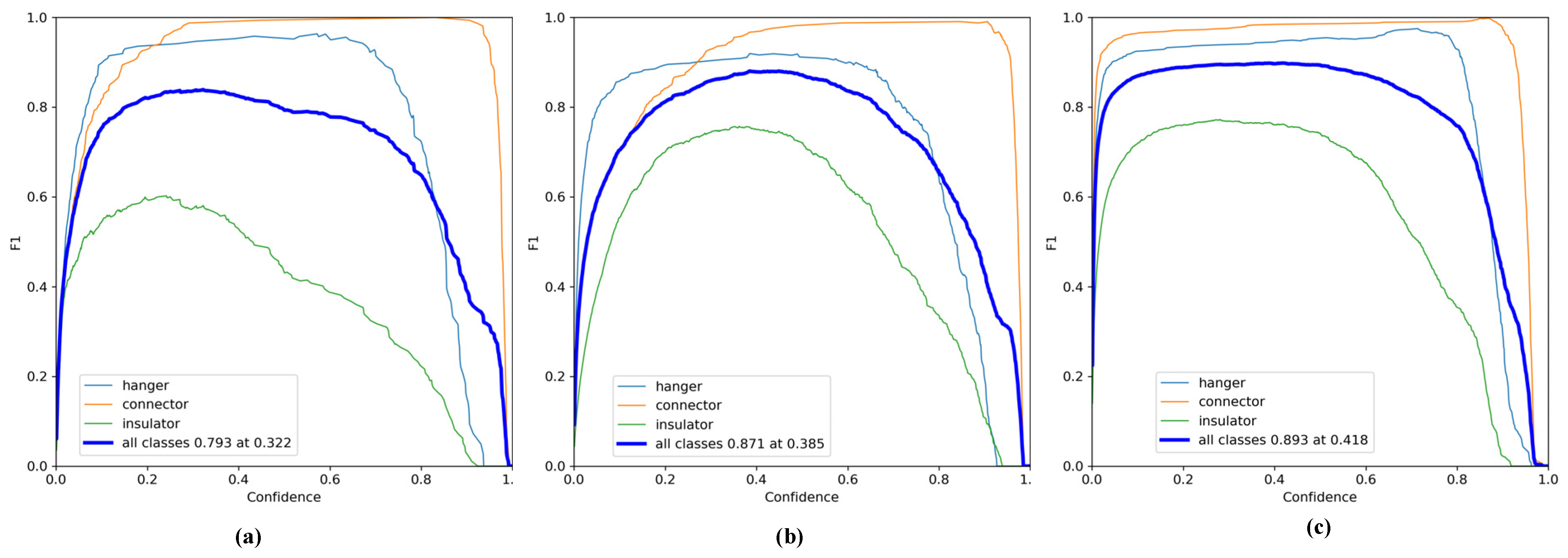 In order to obtain some numerical results to evaluate the sufficiency of the dataset for achieving a specific detection performance by evaluating metrics such as mAP, Pr, Rc, and F1-score. Figure 7 shows the Pr vs. Rc graph of the first iteration of the simulation. In this simulation, we evaluate mAP when the intersection over union (IoU) threshold is 0.5 (mAP@0.5). In this case, the IoU ≥ 0.5 is considered a TP, and the rest are considered FPs. In general, DL shows the highest performance considering the higher area under the curve compared to DL and DM. For every component detection, the insulator shows much lower performance compared to the hanger and connector.