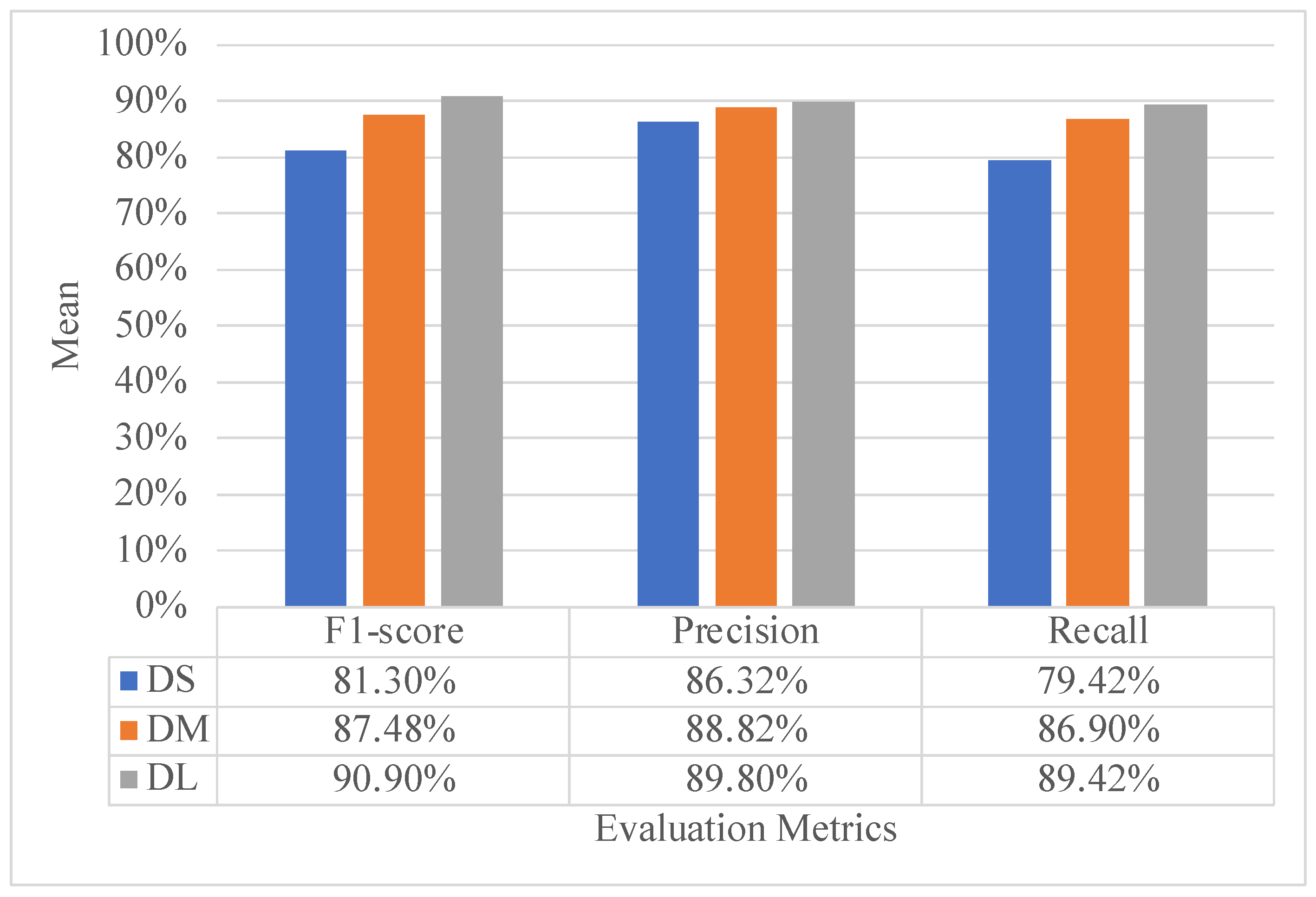 Other than mAP, the F1-score, Pr, and Rc are also evaluated in this research. Figure 9 shows the F1-score vs. confidence level for the first simulation of three sizes of datasets. In general, it shows that there is an increase in performance along with the increase in the number of datasets, especially for higher confidence level values. The average F1-score, Pr, and Rc results at a confidence level of 0.5 for five iterations are calculated and shown in Figure 10. The F1-score, Pr, and Rc results (Figure 10) show that the model achieves maximum performance in the DL dataset with 90.90% F1-score, 89.80% Pr, and 89.42% Rc. Figure 11 is presented to show the variability across cross-validation folds. In general, the standard deviation of evaluation metrics decreases along with the increase in dataset size. The DL can achieve a standard deviation of about 5% or less for all evaluation metrics.
