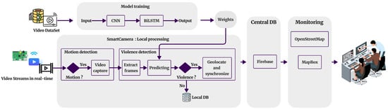 The LAVID architecture is based on a pre-trained model implemented on Raspberry Pi to run the violence detection process. Figure 2 illustrates the main architecture of the proposed approach. Two phases are involved in this approach: model training and local processing.
