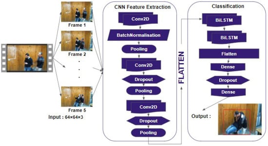 To enhance our model’s performance and regularize its behavior during training, we apply Dropout as a regularization technique []. During the training process, some layer outputs are arbitrarily ignored and dropped out. As a result, the layer appears to have a different number of nodes and synapses than the preceding one. During training, the random removal of nodes and synapses is performed using a configurable parameter that determines the probability at which outputs of the layer are retained. In neural networks, a common practice is to use a probability value of 0.5 for retaining the output of each node in hidden layers, while a value close to 1.0 is often used for the input layer. Hence, adding dropout to the convolutional layers has the effect of making the training process noisy. This conceptualization suggests that dropout may disrupt situations where network layers co-adapt to rectify errors from previous layers, thereby enhancing the model’s robustness. Dropout can be used with most types of layers, such as convolutional layers and recurrent ones (e.g., long short-term memory (LSTM) networks). We implemented dropout in our convolutional blocks alongside the BiLSTM network. Thus, we ensure consistency throughout the training process and improve our model’s performance. Finally, the last stage in the development of our violence detection method is frame classification. This classification stage consists of two BiLSTM layers, two dense layers, and one dropout layer. The extracted features from the earlier 2D convolutional blocks are passed through a flatten layer and fed to a bidirectional LSTM network (BiLSTM) to retrieve information in both forward and reverse directions for learning patterns of anomalous activities. A bidirectional long short-term memory (BiLSTM) network is a type of recurrent neural network (RNN) that consists of two long short-term memory (LSTM) networks whose outputs are combined. BiLSTM, which is trained to utilize all available input data from both past and future time frames, helps to overcome the limitations of a standard LSTM. The concept is to divide the state neurons of a conventional LSTM into two sections: forward states, which handle the positive time direction, and backward states, which handle the negative time direction. This processing of sequence data in both forward and backward directions enhances model performance on sequence classification tasks. BiLSTM consists of memory cells that have a gated cell structure. Based on the importance of features, gated cells in the LSTM memory determine whether to store or delete information. Weights are assigned to the significant features during the algorithm’s learning process. Over time, the network learns important features. The input, forget, and output gates constitute an LSTM. When a new input is received, the input gate determines whether to allow it, discard it as unimportant (forget gate), or let it affect the output at the current time step (output gate). The BiLSTM network helps the model capture long-term dependencies in the input sequence while requiring a low-complexity implementation, making it an excellent solution for real-time video processing. The output from the last BiLSTM layer is passed to a dense layer, as illustrated in Figure 3, and the issue of overfitting is circumvented by employing the dropout technique. This technique not only encourages the network to learn more effective features but also enhances the model’s generalization capabilities.