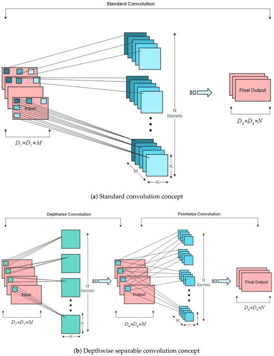 Depthwise separable convolution is a process that involves two operations: depthwise convolutions and pointwise convolutions. Unlike standard convolution, where the convolution process is performed for all M channels simultaneously, depthwise convolution is applied to a single channel at a time. Hence, the kernels will be of size , the output will have a size of , and the computational cost of depthwise convolution is as follows: