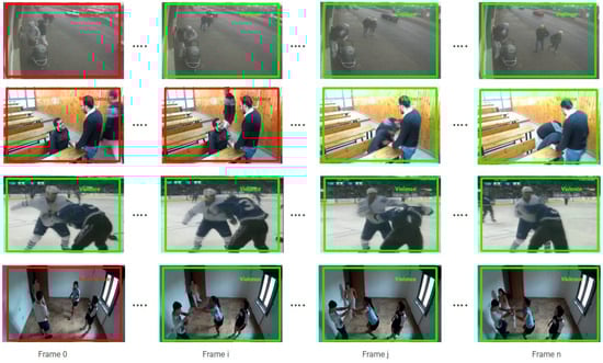 Violence-extracted sequences (framed in green) and non-violence-extracted sequences (framed in red) using our proposed method DSCNN-BiLSTM.