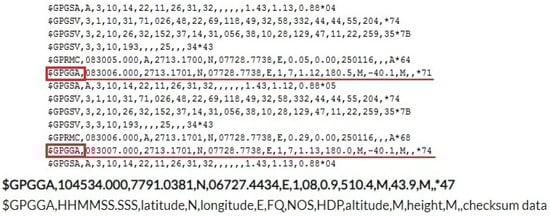 GPS is a Global Positioning System that detects the latitude and longitude of a location on Earth, along with a specified Coordinated Universal Time (UTC). The GPS module plays a central role in our study of the multi-camera surveillance and geolocation system for detecting violence. It receives satellite coordinates at one-second intervals, including time and date. The GPS module sends real-time tracking data in the form of NMEA. The $GPGGA string contains the coordinates, time, and other useful information, as shown in Figure 6. the coordinates can be extracted by counting the commas in the string. The latitude can be found after two commas and the longitude can be found after four commas, as shown in Table 1 [].