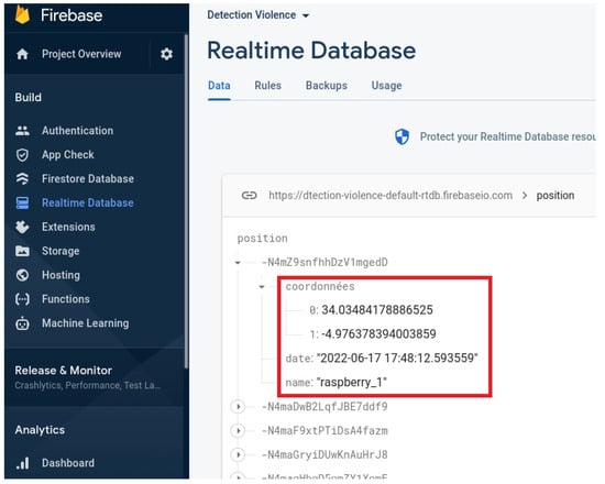 The next step involves collecting and integrating the geographical coordinates into a central database. Smart cameras store the geographical coordinates each time a violent act is detected. This process is executed continuously to provide a real-time tracking system. For robust and reliable storage, we selected Firebase, a scalable platform that offers real-time data handling capabilities.