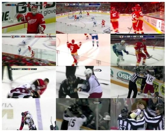 - Nievas et al. presented two video datasets for violence detection, namely, Hockey Fights and Movies Fights []. The Hockey Fights dataset comprises 1000 short video clips captured from National Hockey League games. Each clip consists of approximately 50 frames with a resolution of 360 × 288 pixels. The clips primarily showcase close-up footage of fights between players. The dataset presents various challenges for detection models, including diverse viewpoints, camera movement, and the variety of individuals involved in each violence clip.The Movies Fights dataset includes 200 short video clips showcasing 100 person-on-person fights. This collection also contains 100 non-fight scenarios showcasing various sports footage and samples from the Weizmann action recognition dataset. Each sequence consists of around 50 frames with a resolution of 720 × 480, although some have a resolution of 720 × 576. Movies Fights offers a wider variety of scenes but may be impacted by interlacing artifacts.