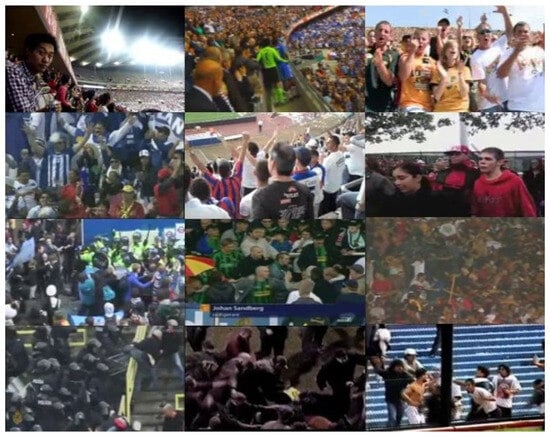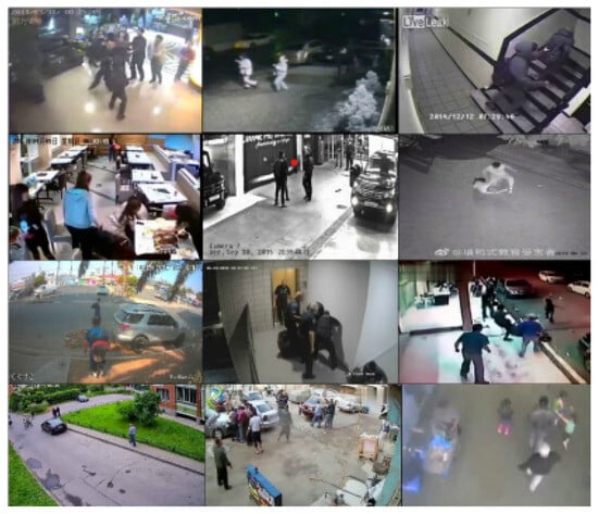 - Hassner et al. introduced the Violent Crowd [] dataset, which comprises 246 short video sequences from YouTube depicting various settings like football stadiums, bars, and demonstrations. The videos capture indoor and outdoor areas using both stationary and mobile cameras, with an image resolution of 320 × 240 and varying video lengths ranging from 50 to 150 frames. Challenges in this dataset include image quality issues such as compression artifacts, motion blur, text overlay, flashlights, and differing temporal resolutions, which make accurate extraction of motion information challenging.