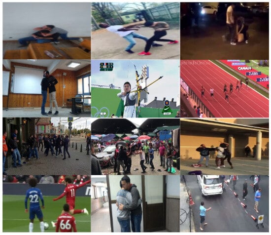 - Cheng, M.; Cai, K.; Li, M. RWF-2000: An Open Large Scale Video Database for Violence Detection. In Proceedings of the 2020 25th International Conference on Pattern Recognition (ICPR), Milan, Italy, 10–15 January 2021; pp. 4183–4190, ISSN: 1051-4651. [Google Scholar] [CrossRef]