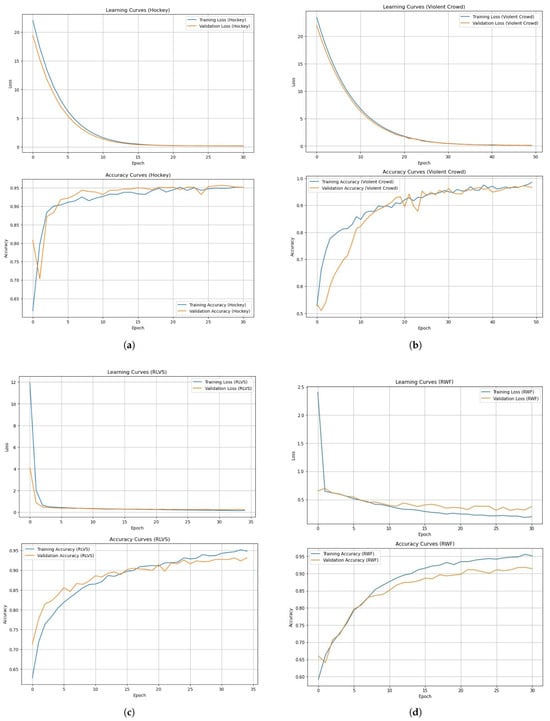 For the RLVS dataset, methods that combine transfer learning and LSTM have shown promising results. Indeed, CNN+LSTM [] achieved an accuracy of 92.00%, while DenseNet121+LSTM [] achieved an accuracy of 92.05%. In our approach, we opted to use bidirectional long short-term memory (BiLSTM) to better capture the spatio-temporal information in both directions. This enabled us to achieve an accuracy of 92.73%, slightly outperforming other approaches. On the RWF-2000 dataset, several methods have been proposed for detecting violence. Aldahoul et al. [] achieved an accuracy of 73.35% with their CNN+LSTM approach. Another approach utilizing a MobileNetV2 pre-trained model with LSTM, as suggested by Romas et al. [], achieved an accuracy of 82%. Choqueluque-Roman et al. [] proposed a Fast R-CNN architecture to extract spatio-temporal information, achieving an accuracy of 88.71%. In comparison, our DSCNN-BiLSTM approach achieved 91.06% accuracy on the RWF-2000 dataset.