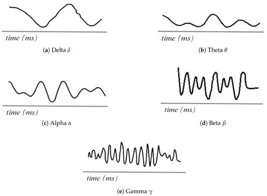 As shown in Figure 2, the EEG records the electrical activity of the brain in the form of waves, which are classified according to their frequency: these include the delta, theta, alpha, beta, and gamma signals. Each wave is associated with different brain states, functions, and activities [19,25].