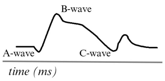 Figure 3 describes an ERG signal. The main waves, such as the A-wave, represent the initial hyperpolarization of the photoreceptors in response to the light stimulus. This is described as a negative wave. The B-wave is generated due to the transmission of signals from the photoreceptors to the inner layers of the retina. It is also described as a positive signal. In addition to other complementary waves, such as the C-wave, which appears to be a late response in the ERG, oscillatory waves can also be observed in certain protocols related to the activity of other cells and providing additional information on the function of the inner retinal layers [42,43].