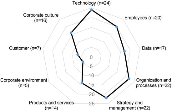 Data play a prominent role in most maturity models. In a number of models, there are dimensions that address data acquisition, data storage, and further processing separately. Other contributions address the use of AI specifically for data quality problems, e.g., uncertainties or incomplete data, and call for data to be treated as a special object of investigation [15]. Hein-Pensel et al. [16] have examined n = 24 models for the maturity of Industry 5.0, categorizing areas of expertise in dimensions depicted in Figure 1, in which the models show a large overlap with AI maturity models and show that 17 models address the dimension of data.