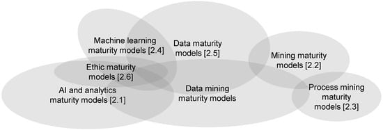 When discussing maturity models for the purpose of data mining in companies, the overarching topic of AI is an obvious starting point. Data mining and AI are closely related, as AI algorithms are often used in the field of data mining. In general, however, AI encompasses a wider range, such as technologies, frameworks, and tools [10]. There are different models (some of which are individualized) that are used to evaluate the possibilities of using AI in companies. In the literature, these models can be found under many catchphrases, such as big data maturity models, digital maturity models, or Industry 4.0 and 5.0 maturity models. Most models are based on question catalogues, which are usually evaluated according to a simple binary scheme, thereby determining the AI maturity level. Alternatively, there is occasionally a matrix scheme that is implemented either as a simple decision matrix or in a few cases via a rating scale. The maturity level is either specified as a percentage or in corresponding steps or levels (on average five; cf. [5]). In general, a higher nominal or percentage value means a higher maturity level. It is striking that a large number of the models originate from practice, and only a few of them have been published by scientific institutions. Table 2 lists relevant representatives of the large number of practical models.