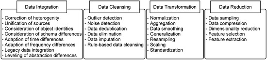 According to García et al. [3], data preparation involves adapting the data to be processed to the requirements of the data mining algorithms, thereby making data mining possible. The data preparation phase is described differently in the various data mining process models. In the literature, the definition of the exact task and scope of the data preparation phase differs depending on the process model, as does the data preparation phase itself. For example, Fayyad et al. [1] separate data preparation and data reduction into individual phases, whereas this is not the case with CRISP-DM [23]. With regards to the often included phases in data mining process models [2], all steps between the selection of the data to be used on the basis of a superordinate question and the data mining are defined as data preparation in this paper. As per García et al. [44], this includes the steps of data integration, data cleansing, data transformation, and data reduction. Before data mining can be applied, the data preparation phase must fulfill different tasks that are derived from the requirements of the data mining algorithms, requiring procedures for processing these tasks. Due to the fuzzy definitions of the individual steps between different sources of data preparation, the tasks to be performed for suitable data preparation are outlined below and summarized in Figure 4.
