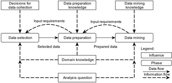 In Figure 5, the three discussed phases of the data mining process and the raw data flow of the selected data used for data preparation and prepared data for data mining are depicted. In addition to the data flow, there are different information flows. The aforementioned input requirements from data mining to data preparation and from data preparation to data selection, which determine the raw data, show the technical demands on the respective preceding phase. Different information flows of external influences also affect the data preparation pipeline in the respective phases. The higher-level analysis question can influence the data selection and data mining processes, whereby the data mining task should be specified to define the input requirements of the phases or deliberately kept open in order to check the applicable data mining algorithms. The latter may require an iterative approach between data preparation and data mining. All phases require domain knowledge and subject matter experts to make decisions with regard to the content background. In addition to the analysis question, data selection is based in particular on the existing data, which are defined by past decisions made on data collection. This process also includes the collected errors. Data preparation requires expert knowledge about the applicable data preparation procedures, which are subordinate to the implementation of data preparation tasks. Finally, expert knowledge of data mining algorithms and the technical applicability to answer the analysis question are required for the data mining phase. While the phases in the data preparation pipeline have been explained above, the influences are the subsequent subject of consideration, as the maturity models for data preparation precisely consider these influences for the evaluation of the data preparation phase.