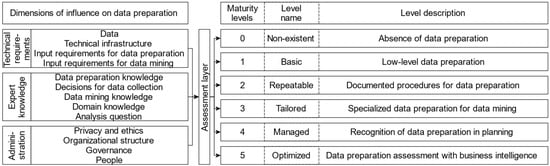 Data preparation knowledge has to consider the initial state of the company’s data in the data preparation pipeline and the planned objectives to be achieved by the analysis. This knowledge is not targeted specifically by existing maturity models in the literature. Sonntag et al. [5] explicitly mention data preparation in their maturity model but without going into detail. In data management maturity models, the focus is predominantly on the administration of data in the context of metadata, governance, management, and data quality. The level of detail required for the evaluation of data in the context of analyses and the best possible preparation cannot be seen from the meta-studies by Belghith et al. [28], Curry and Tuikka [27], Hein-Pensel et al. [16], Król and Zdonek [21], and Sadiq et al. [6]. However, many of the maturity models listed in these studies place the administration of data management and data quality assessment in the context of organizational decisions and evaluate them accordingly.