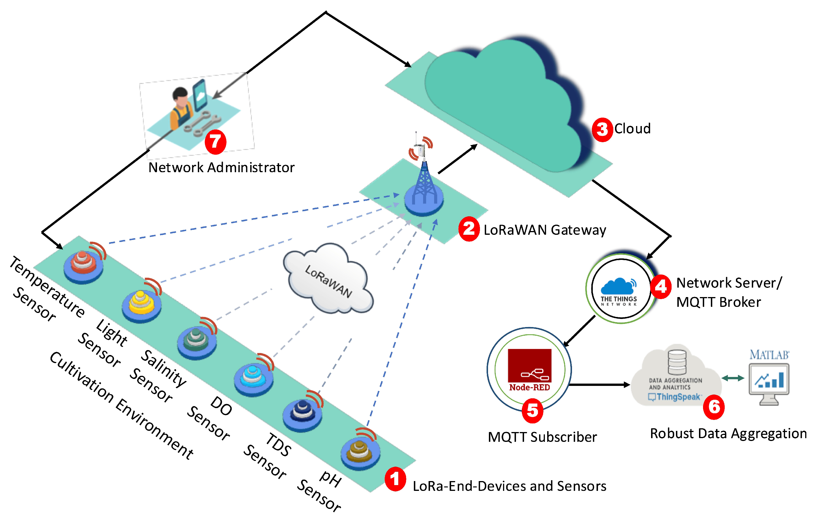 Figure 2, marked with a red circle labeled 6. ThingSpeak provided real-time monitoring capabilities for water quality and nutrient levels, crucial for