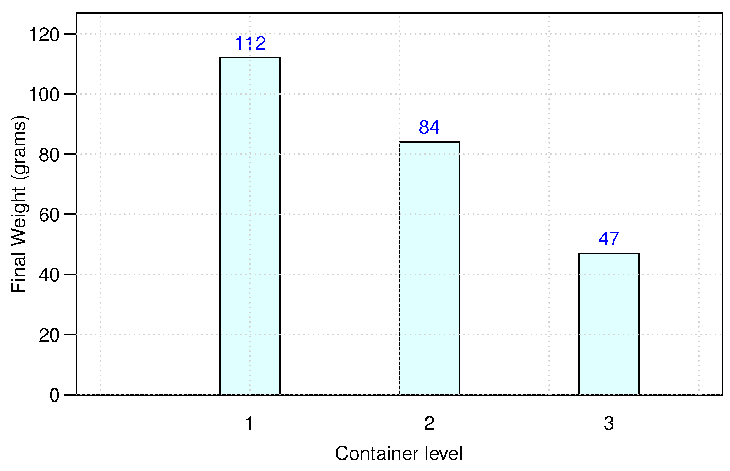 Sargassum sp. in the circulation system varied across container levels, with 112 g in level 1, 84 g in level 2, and 47 g in level 3 as shown in