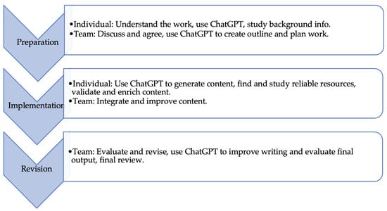 - Implementation: Generate and validate content individually, then integrate and improve it as a team.