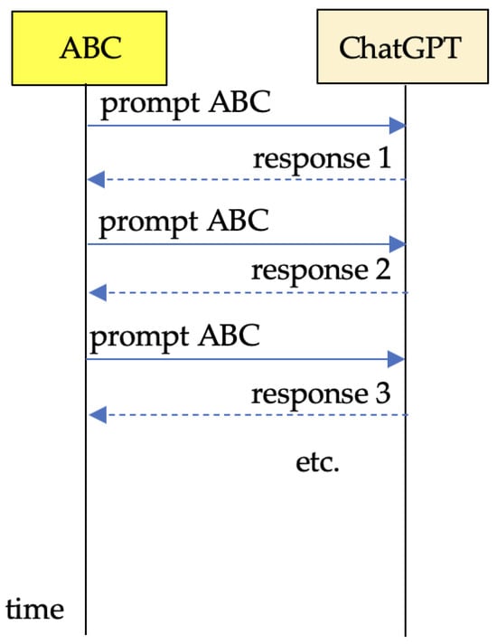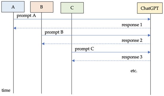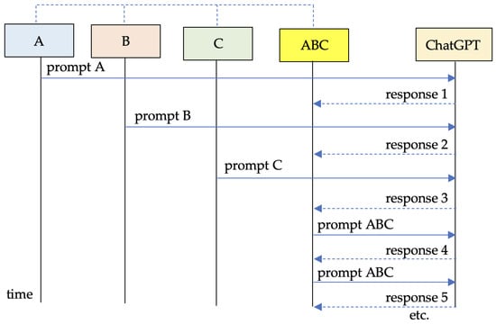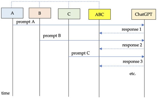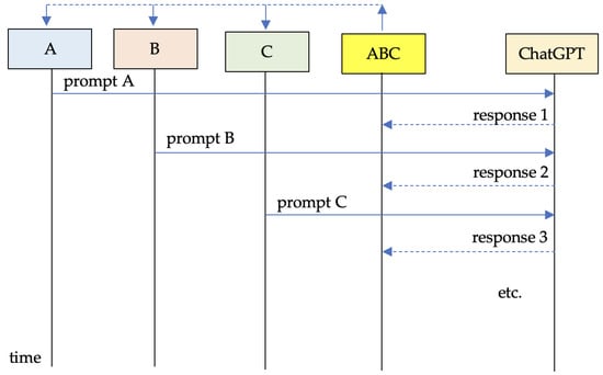Collaborative Mode #1 (one in a row) sequence diagram of team ABC (members: A, B, and C) when interacting with ChatGPT.