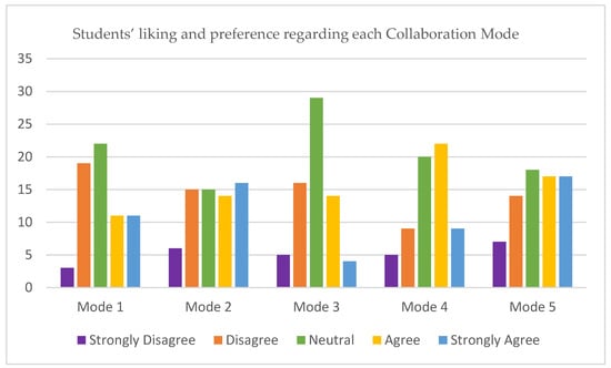 Students possess diverse skills and preferences, with some preferring structured collaborative settings and others favoring flexibility and independence. By experimenting with different collaboration structures, they can develop essential skills such as communication, teamwork, conflict resolution, and leadership. Investigating various collaborative patterns helps educators create effective learning environments that promote inclusivity and engagement. In this study, students did not have strong preferences regarding a specific Collaboration Mode (Table 2, Figure 7). On average, their responses regarding their liking and preference of each Collaboration Mode were close to neutral (M = 3). They marginally liked Mode #1 (M = 3.12, SD = 1.14), Mode #2 (M = 3.29, SD = 1.31), Mode #4 (M = 3.32, SD = 1.12), and Mode #5 (M = 3.15, SD = 1.29). On the other hand, they marginally did not like Mode #3 (M = 2.94, SD = 0.99).