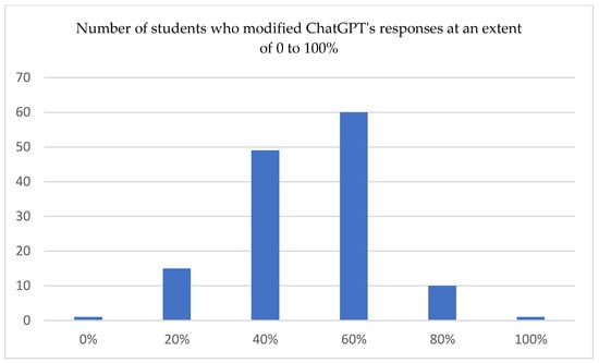Knowing the extent to which students modify ChatGPT’s responses helps educators understand how effectively students engage with AI-generated content. It can inform educators whether students use ChatGPT to comprehend the educational subject or whether they just copy its responses. On average, students modified the responses of ChatGPT at a rate of 50% (SD = 0.17). Most students (44.1% of students, n = 60) reported that they modified ChatGPT’s responses at a rate of 60% (Figure 9). Fewer students (36% of students, n = 49) reported that they modified ChatGPT’s responses at a rate of 40%. Similar fractions of students (11%, n = 15 and 7.4%, n = 10) reported that they modified ChatGPT’s responses at a rate of 20% and 80%, correspondingly.