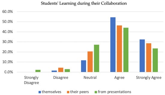 Additionally, this study adopts a mixed-methods research approach []. Student responses were analyzed both quantitatively and qualitatively. Descriptive and inferential statistics were used for the quantitative analysis of students’ responses to closed-ended questions, while content analysis [] was applied for the qualitative analysis of students’ responses to open-ended questions, as well as data from observations of teams’ presentations, focus group discussions, and teams’ reports.