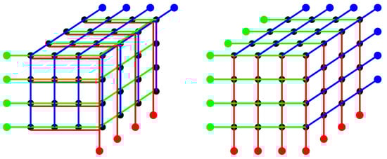 Cube with data bits (black) arranged in dimensions. (Left): with usual parities from 3 planes (green, blue, red), each with dimensions. (Right): with 1-dimensional parities (green, blue, red for different dimensions).