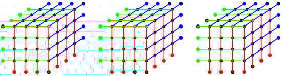 As an example, we might consider again the data bits from Figure 1. If we arrange them in dimensions, we obtain and thus parity bits, i.e., more than for , where we had 12 parity bits (cf. Section 1). Yet, an arrangement in dimensions with side length 3 is also possible. As , we waste some bits, yet the number of parity bits is still , and the “superfluous” bits could be ignored by assuming them to be 0 or could be used to add further redundancy. While seems not to be interesting as is too small and cannot be better than , we finally consider , leading to a cube of side length 2 with parity bits. The difference to smaller dimensions is that for , each parity bit is computed over 32 data bits, while for , each parity bit is computed over 16 data bits. The code rates for are , respectively.