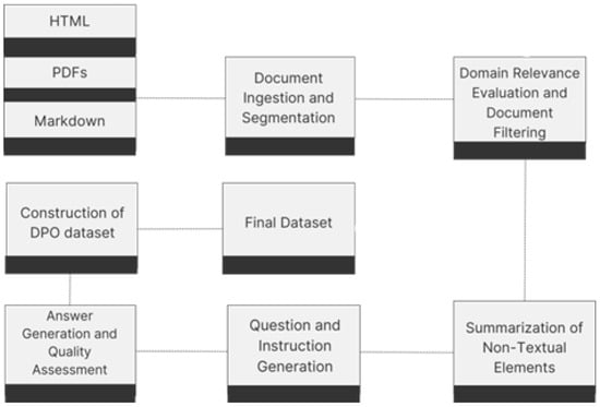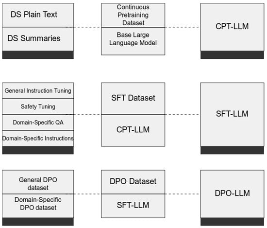 The framework enables systematic adaptation while maintaining evaluation standards throughout development. This process incorporates components from previously well-tested dataset creation processes [24] and document preprocessing methods, involving the design and execution of two pipelines to enhance LLMs’ comprehension and task performance within specific domains. The pipelines process documents such as PDFs using natural language processing techniques to construct structured datasets for model training, as illustrated in Figure 1. The created datasets are then used for continuous pre-training, supervised fine-tuning, and direct preference optimisation (DPO). Figure 2 [25].