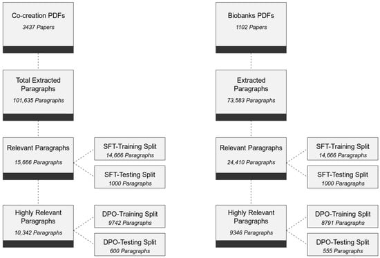 We tested our training methodology in the previously mentioned use-cases, public health co-creation and biobanking. In both our use-cases, human experts were used to identify the most relevant academic literature of the respective fields, biobanking and co-creation. For the biobanking use-case, 1102 documents were identified, including academic papers, training material, and more. For the co-creation use-case, 13,000 academic papers were initially selected from the Co-Creation Database [22]. After a second identification round, 3437 academic papers were chosen to create the training dataset. For the biobanking use-case, we decided to use a Mistral 7B model, while for the public health co-creation, we decided to use a Llama 3 model as our base model. Using the methodology described above, two datasets were created for the two use-cases. Their final states are composed of paragraphs, questions or instructions, and answers. For the continuous pre-training step, the base LLM undergoes an extended pre-training phase aimed at augmenting its understanding of domain-specific knowledge. For this step, two types of data were used: question–answer pairs and plain unstructured text. This phase serves as an initial step in enhancing the model’s comprehension and adaptability to domain-specific tasks and scenarios, laying the groundwork for subsequent fine-tuning tasks. During the pre-training step, the training objective was next-token prediction, a self-supervised objective. Given N sequences from the co-creation and biobanking datasets, where each sequence contains n tokens, we defined the loss function as the sum of negative log probabilities of the next token given the previous tokens in the sequence , where is the model we are training.