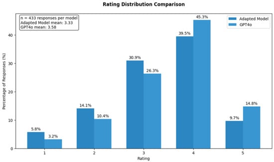 The adapted model achieved a mean rating of 3.33, while GPT4 received a mean rating of 3.58. The distribution shows that both models received predominantly positive ratings, with the highest concentration in the 3–4 range. GPT4 obtained more ratings at the higher end of the scale, with 45.3% of responses rated 4 out of 5 compared to 39.5% for the adapted model. The proportion of top ratings (5/5) showed a similar pattern, with GPT4 receiving 14.8% versus 9.7% for the adapted model.