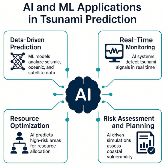 • Data-Driven Prediction: ML models analyze seismic, oceanic, and satellite data to predict tsunami events. For example, convolutional neural networks (CNNs) have identified tsunami precursors in seismic waveforms, improving early warning systems [20]. Studies in Japan and Indonesia have demonstrated ML’s ability to provide minutes of warning before tsunami impact [37,38].