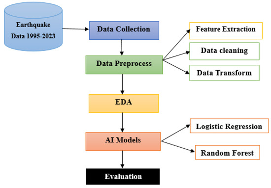 The methodology of this research is predictive, showing that tsunami occurrence forecasting is used to collect the preprocessed and analyze the earthquake data, and is followed by the development and evaluation of machine learning models for forecasting seismic events. As shown in Figure 2, it begins with data collection from the public Kaggle repository and then focuses on cleaning and preprocessing methods contributing to data quality and relevance. The machine learning models, including Random Forest and Logistic Regression, are then developed to predict tsunami occurrences caused by earthquakes based on selected features. Exploratory Data Analysis (EDA) is conducted with maps and charts to visualize earthquake patterns and to provide regional risks. The models’ performances are evaluated with critical metrics, and a comparative analysis with traditional forecasting methods is performed to validate the effectiveness of the planned approach.