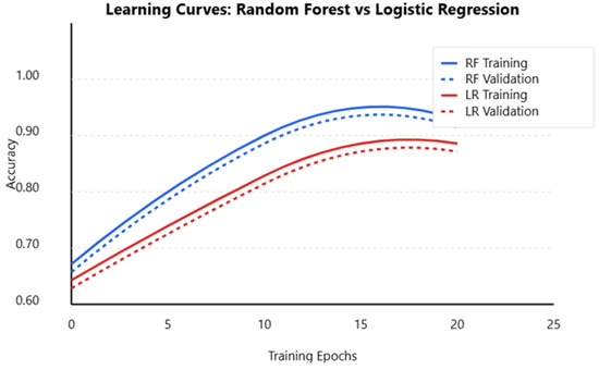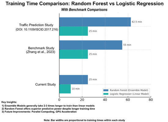 The training time of machine learning models is a critical factor in real-world predictive applications, particularly for large-scale datasets. In this study, as shown in Figure 9, the Random Forest model required approximately 25 min for training, while the Logistic Regression model completed training in just 10 min. The increased training time for Random Forest is due to its ensemble nature, where multiple decision trees are constructed and aggregated for better accuracy. Future improvements, such as parallel computing or GPU acceleration, could further reduce training time while maintaining accuracy.