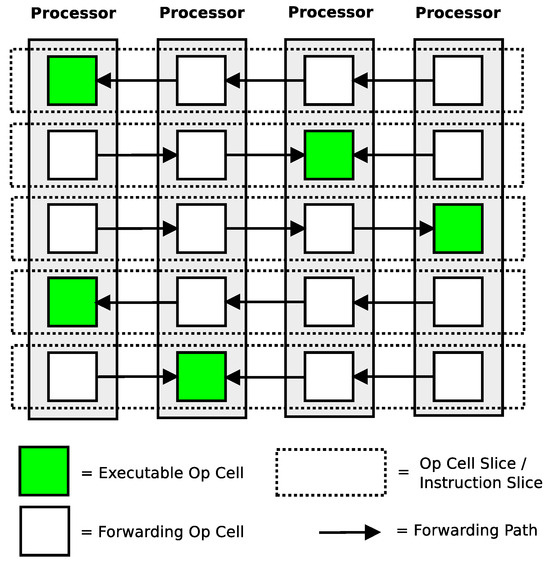 An interconnected collection of these single dataflow processor cores creates a compute fabric in which a program’s instructions can be migrated around (i.e., “draped”) without changing the program itself. The family of all possible processor counts along with all possible interconnection implementations define the polymorphic computing architecture. Figure 3 shows an example of a program placed in one possible implementation of the polymorphic architecture. A single instruction is only assigned to be executed by one processor core. Operation cells in processors not assigned to execute that instruction forward their inputs to the operation cell that is assigned to execute the processor. Notice that program instructions can be migrated from one core to another if the input forwarding is maintained. A movement of an instruction between cores effectively presents a different configuration of the computing architecture to a program. This ability to migrate instructions (i.e., change the computer architecture that is presented to a program) makes this a polymorphic computing architecture. (Note that a particular arrangement/placement of instructions in the fabric is referred to as a “geometric placement”).