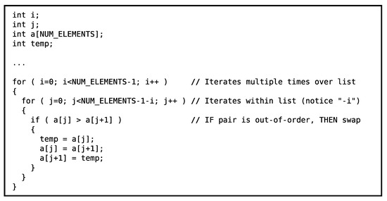 The traditional bubble sort algorithm is expressed algorithmically in Figure 4 [18]. It is composed of an outer loop that iterates over the entire list multiple times and an inner loop that iterates across contiguous element pairs in the list. Essentially, the inner loop implements a sliding window that encompasses two contiguous elements at a time. When the two elements are out-of-order with respect to on another, the elements are swapped. The type of list ordering (i.e., ascending in value, descending in value, etc.) is selected in the “if” condition inside the loops by specifying how one value is greater than another. Overall, the two loops sweep the swap window over the list multiple times. The smaller values appear to “bubble” to one end of the list, while the larger values settle to the other side of the list.