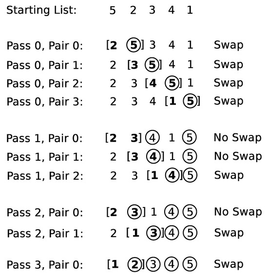 Figure 5 shows an example of a list of numbers in descending order that is bubble sorted into ascending order [18]. The “bubbles” are shown as circles and the swap window is shown as brackets. The term “pass” refers to the iteration number of single single sweep of the swap window through the entire list (i.e., the index of the outer loop in Figure 4). The term “pair” refers to the index of the left value in the swap window (i.e., the index of the inner loop in Figure 4). Notice that the largest value in a pass of the swap window across the list always ends up in its final sorted list position. In successive passes of the swap window, there is no need to include values that are in their final sorted position, so the algorithm skips these values in successive passes of the swap window.