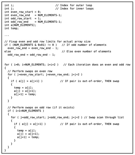 However, the traditional bubble sort algorithm can be rearranged so that a set of swap windows can be executed in parallel at any one time (i.e., they have no dependencies with one another). This rearrangement is called an odd–even sort [27,28,29,30,31,32]. Figure 6 shows a rearranged version of the bubble sort algorithm (i.e., an odd–even sort algorithm) where the iterations of the inner loops can be executed in parallel (i.e., the loops can be “unrolled”).