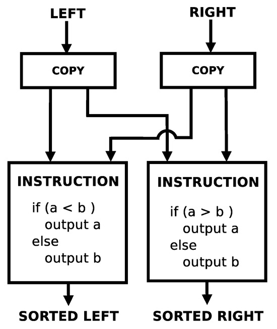 The odd–even sort algorithms that are executed in this work are expressed in diagrams that reflect the underlying instruction set of the dataflow processor cores. See [16,18,19] for further details of the instruction set.