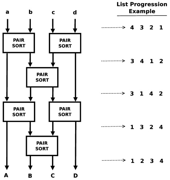 Algorithm: 4-item odd–even sort. The lower case letters (a,b,c,d) represent the input lanes into the algorithm. The upper case letters (A,B,C,D) represent the output lanes positionally corresponding to the input lanes. The numbers positionally represent a test case as it is propagated through the lanes of the algorithm [18].