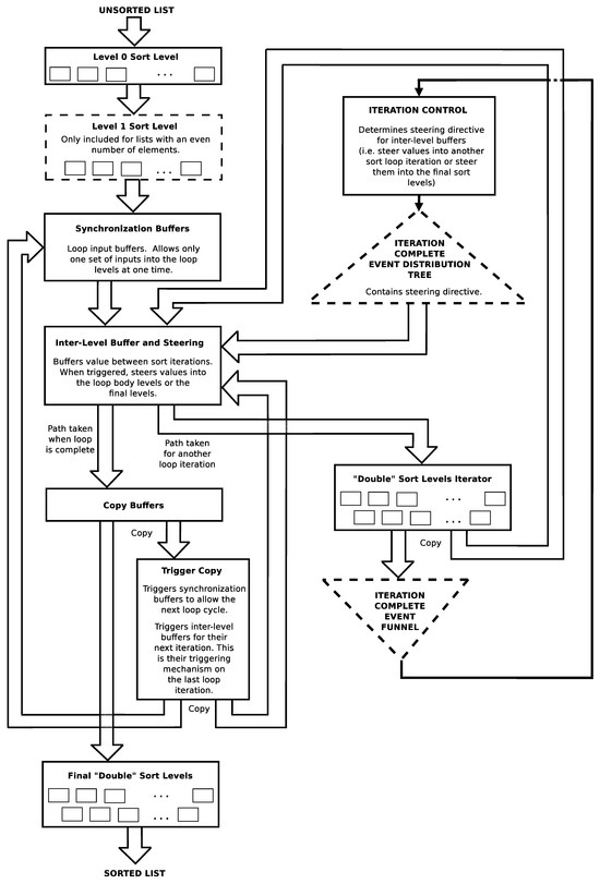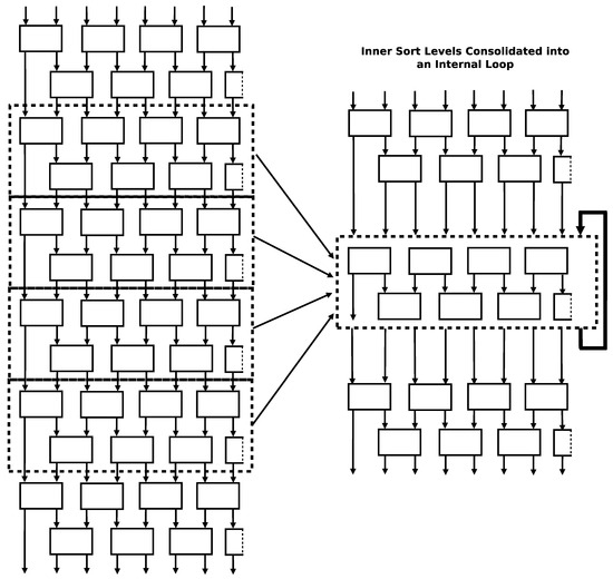 Figure 11 shows a diagram of the compact odd–even sort program that is suitable to be implemented in the dataflow processor instruction set of this work [16,18]. It is the odd–even sort algorithm where the inner swap pair rows are nested inside of a loop. The loop mechanism introduces some overall overhead but does not interfere with the amount of simultaneous parallel execution opportunities within the swap pairs in each row. The program implements the first one or two rows independently (one if there is an odd number of inputs and two if there is an even number of inputs), then implements the loop over the inner rows pairs, then implements the last two rows independently. In the figure, the implementation of the first swap row is shown in “Level 0 Sort Level”. The second swap row is shown in “Level 1 Sort Level” (however, this sort row is only implemented in sorts with an even number of inputs). The inner sort rows are shown in “Double Sort Levels Iterator”. The last two sort rows are shown in “Final Double Sort Levels”. The rest of the figure boxes show algorithm flow control. The minimum number of inputs that this program can handle is five. This is the case because there are the same number of swap rows and inputs in the rearranged algorithm. Since this program executes a minimum of five rows (i.e., a minimum of one independently at the beginning, two in a single loop iteration, and two at the end), this means that it can handle a minimum of five inputs. There is no theoretical upper bound on the number of inputs it can handle though. The first and last rows are implemented independently outside of the loop to act as buffers for different execution instances of the sort. The first rows can accept inputs for the next run of the sort while the current run is still being processed in the loop. These support the necessary serialization of multiple runs of the sort. The last row of sorts acts as buffers for the final result of the previous sort and allows the next run of the sort to progress inside of the loop. This allows a new run of the sort to execute concurrently even when the old run has not fully completed yet. (This may happen when the client of the previous sort has not collected all of its results yet).