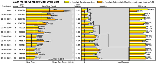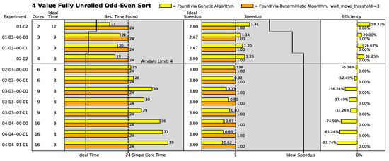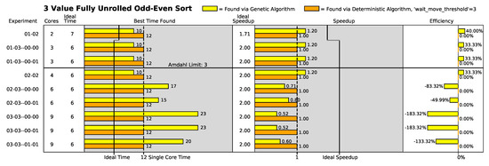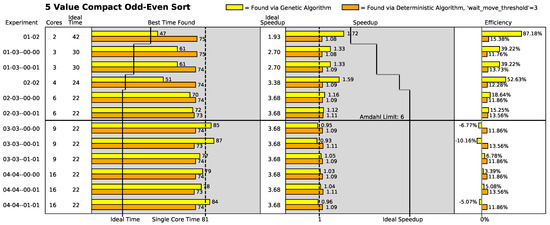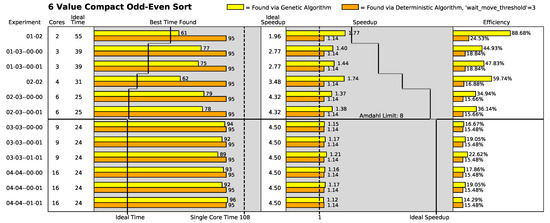 Additionally, in the odd–even sort algorithms where the Amdahl limit is low (the three-value through six-value variants of the odd–even sort algorithm), the deterministic search algorithm generally finds the same best execution speed across all the array configurations (i.e., two-core configurations to sixteen-core configurations). This strongly indicates that the deterministic algorithm usually finds its best solution in a two-core configuration in the low-Amdahl-limit odd–even sort algorithm variants.