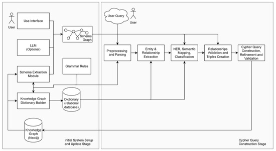 The implementation of our system involves two distinct stages: Initial System Setup and Update and Cypher query construction. During the system setup stage, a Schema Graph and a Dictionary of entities are constructed. In the Cypher query construction stage, NL queries are transformed into Cypher queries. The overall system architecture, including the two stages, i.e., the Initial System Setup and Update Stage and the Cypher query construction stage, is illustrated in Figure 1.