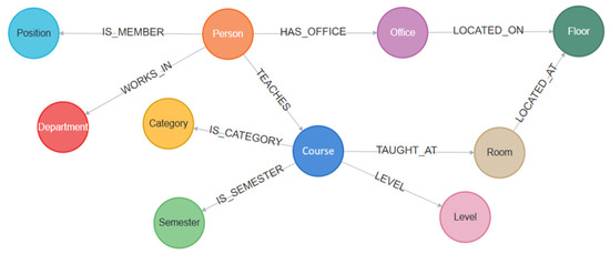 Similar to nodes, relationships also contain properties that provide additional context about the connections they represent. Each relationship type is associated with a specific set of properties that describe its characteristics. For instance, a relationship of type TAUGHT_AT includes properties such as day and time. To enrich the schema, the keys of these properties are extracted and added to the corresponding schema relationships. The properties associated with each group of relationship types in the KG are stored as a list-type property within the corresponding schema relationship.