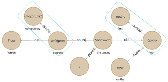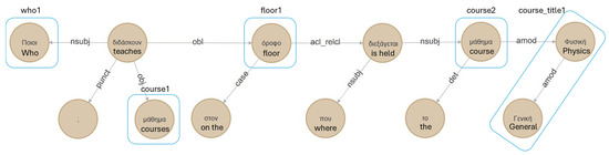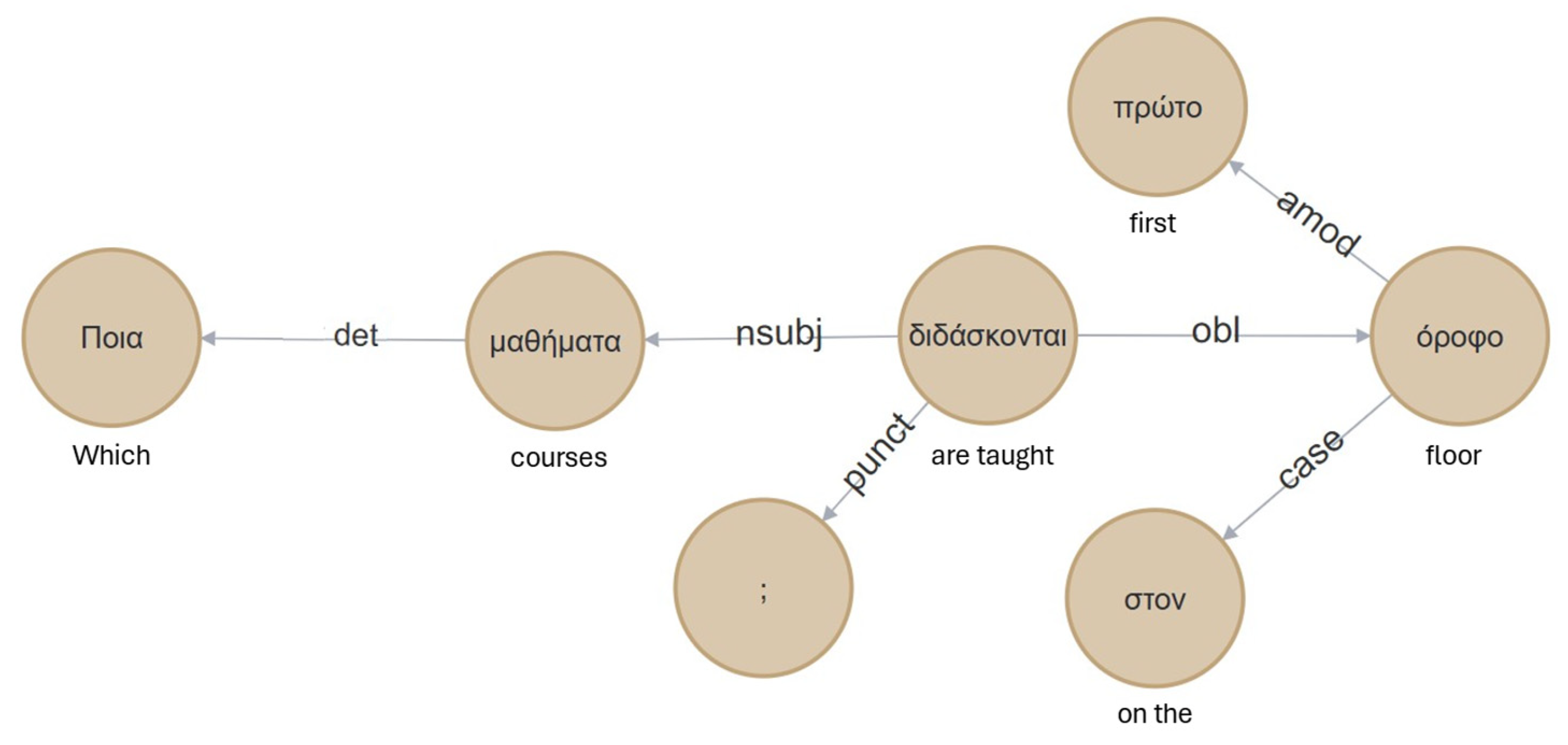 During the system setup, a Dictionary is generated to store the system’s vocabulary. The Dictionary is stored in a relational DB for efficient retrieval and enables fast searches and literal matching against KG data. All entities in the KG, including node names, node labels, relationship types, and property keys and values, are stored and indexed in a relational DB. These stored literals can consist of multiple words. For example, a person’s full name may contain two or three words, while a course’s name could range from two to twenty words. For each literal string, corresponding lexical variations are generated based on grammatical rules, synonyms, and alternate spellings. For instance, the genitive forms of Greek words, including proper names, are automatically created and indexed. In addition, the associated nodes and relationships are also stored and used in the NER process. For example, a person’s name is stored alongside its corresponding node label, Person. The Dictionary is dynamically updated whenever modifications occur in the KG.