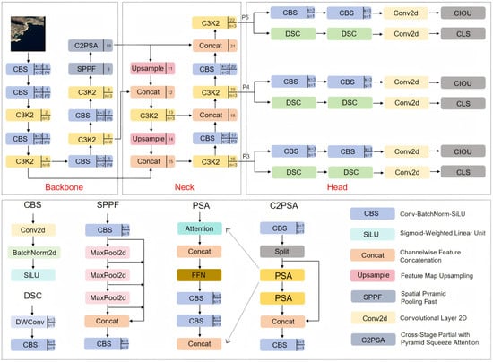 Beyond the YOLO series, other single-stage detectors include SSD (Single Shot MultiBox Detector), which predicts objects directly via multi-scale feature maps but struggles with insufficient semantic information in shallow layers, degrading its small object detection [37]. RetinaNet addressed class imbalance via Focal Loss, yet its feature pyramid’s static weighting allocation limited its multi-scale adaptability [38]. EfficientDet optimized feature pyramids and scaling strategies through Neural Architecture Search (NAS), but its automated architectures showed poor generalization on remote sensing data. Meanwhile, its computational cost is high [39]. NanoDet achieved extreme lightweightness via depthwise separable convolutions and dynamic label assignment, at the expense of distinguishing densely distributed small targets [40]. Considering the low signal-to-noise ratios and dense distribution characteristics of tiny objects in remote sensing imagery, along with the trade-offs among the existing methods, this study selects the lightweight YOLO11 as the baseline model.