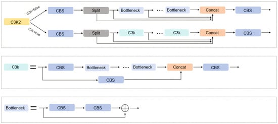 When configured with C3k = false, the module employs standard Bottleneck layers, making it architecturally identical to the C2f module in YOLOv8 through preserved residual connections and feature fusion pathways. When activated with C3k = true, the implementation replaces the Bottleneck modules with a C3k module composed of multiple stacked Bottleneck modules with interleaved group convolutions. This parameter-controlled architecture enables flexible feature representation scaling. The detailed architectural configurations under different parameter settings are illustrated in Figure 2.