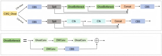 To further enhance the model’s compactness while maintaining precision in detection, we implement a heterogeneous Bottleneck configuration. GhostBottleneck modules replace standard Bottleneck components in shallow C3k2 layers, while retaining the original Bottleneck modules in deep network layers to preserve high-level semantic representation. This stratified Bottleneck strategy synergistically reduces the model’s complexity.